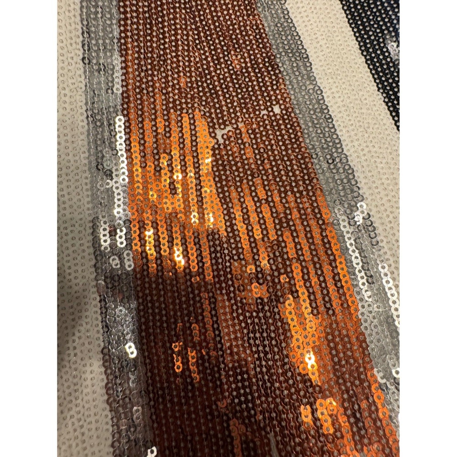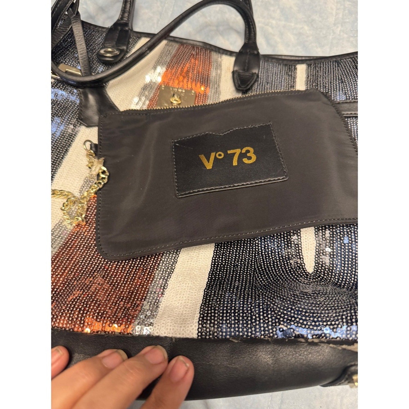 Shimmer meets function. This authentic V°73 tote features an eye-catching sequin design in metallic tones of black, silver, copper, and ivory with black leather handles and trim. Includes the original detachable zip pouch with chain. Spacious interior with logo patch and zip pocket.