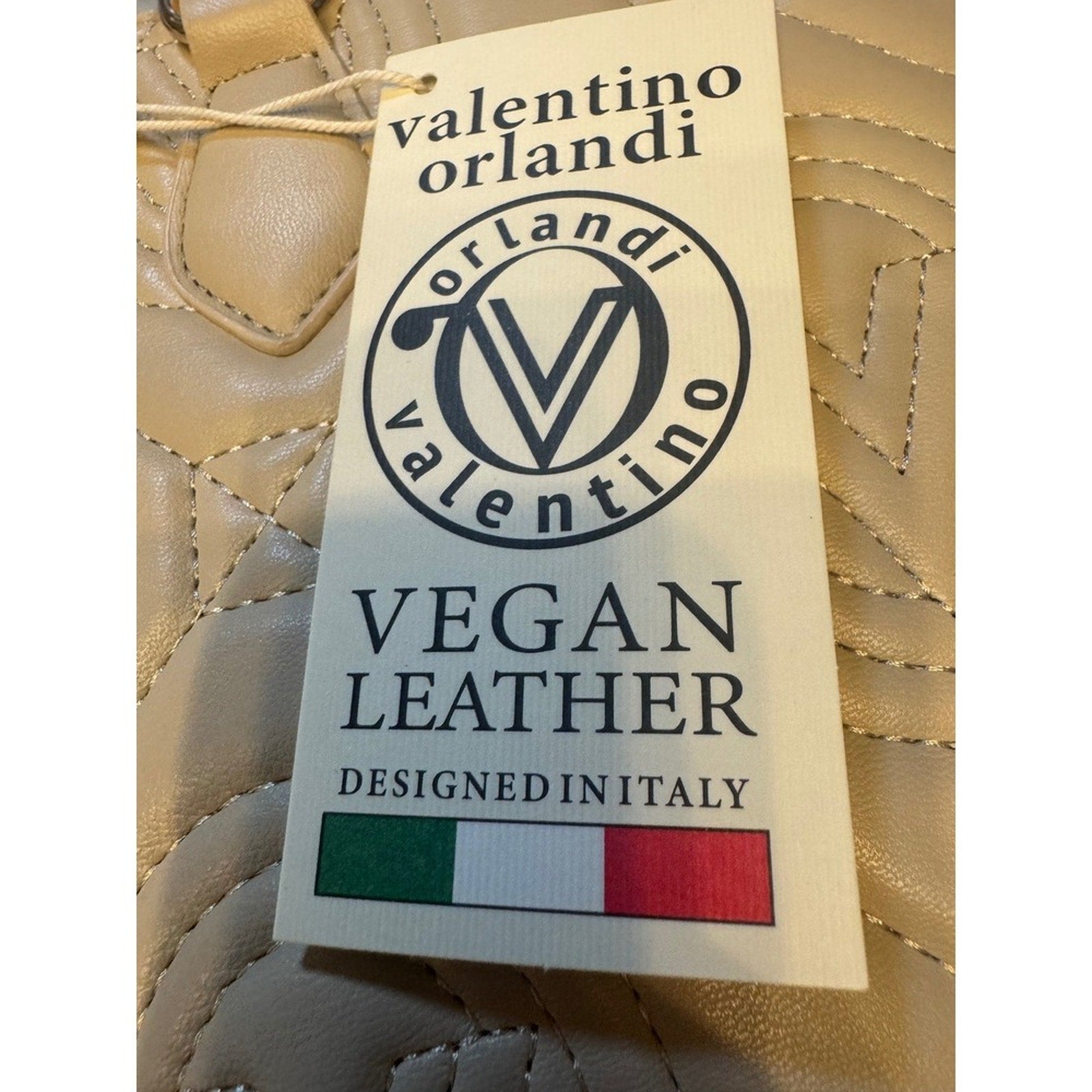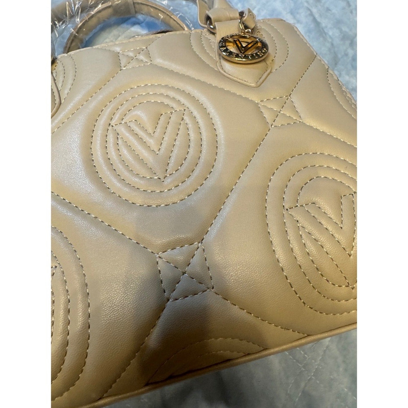 Valentino Orlandi Vegan Leather Quilted Tote Beige Gold Charm Top Handle NWT