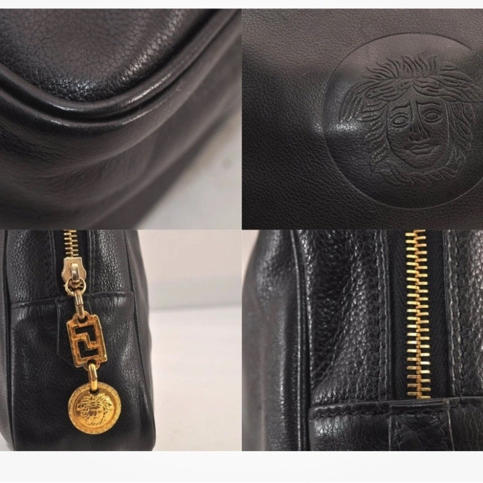 • Zip closure with gold Medusa hardware